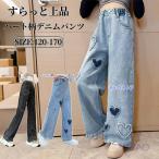 デニムパンツ ジュニア 女の子 ジーンズ 子供 キッズ ワイドパンツ かわいい 春秋 高校生 おしゃれ ハート柄 学生 ウエストゴム 普段着 ブルー 美脚 着痩せ