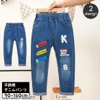 デニムパンツ ロングパンツ 子供服 キッズ ジュニア 男の子 女の子 ジーパン ジーンズ ボトムス ロゴ 長ズボン ウエストゴム ユーズド風 カジュア