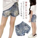 【特価】ビジュー付き デニムショートパンツ キッズ 女の子 ショートパンツ パールビーズ 子供 ジュニア ダメージ加工 クラッシュ加工 ウォッシュ加工 デニム