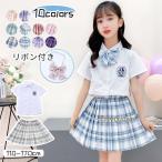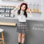 ジュニア 女の子 上下3点セットアップ 半袖シャツ+プリーツスカート+リボン 半袖 リボン付き プリーツ チェック柄 女児 かわいい 学院風 大人気