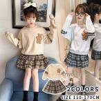 ジュニア 上下2点セット 綿 コットン 長袖プルオーバー プリーツスカート 女の子 長袖 ショット丈 クルーネック クマ柄 女児 チェック柄 上下別柄 無地 かわいい