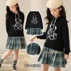 ジュニア 女の子 上下2点セット パーカー プリーツスカート 春秋着 長袖 プルオーバー フード付き タータンチェック柄 フレア 膝上丈 クマ柄 女児 かわいい
