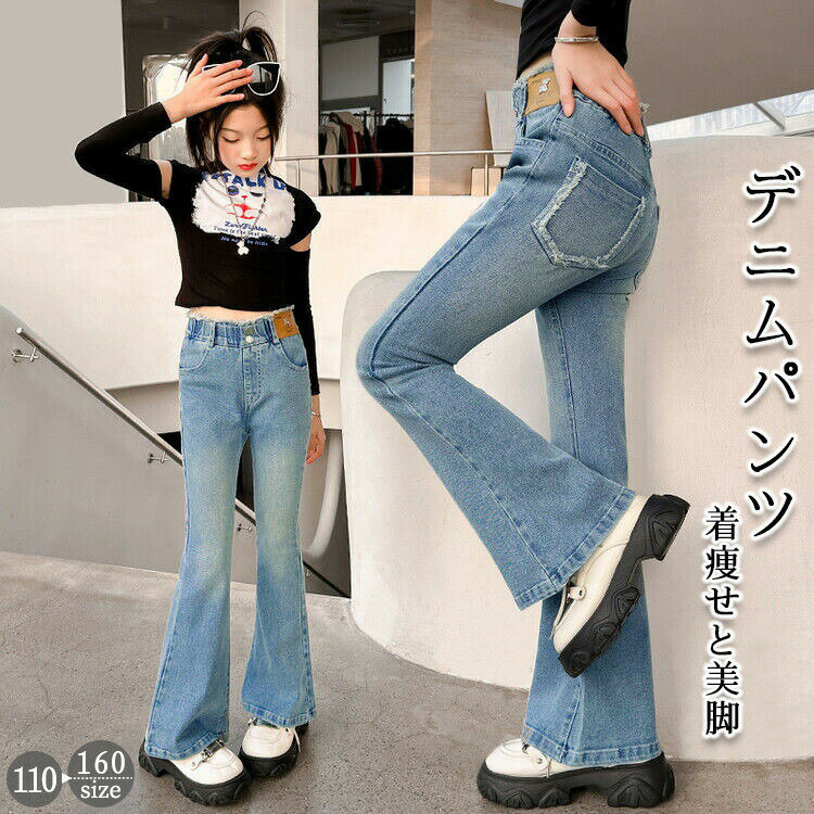 ジーパンベルボトムパンツキッズジーンズジュニア女の子ロングパンツデニムパンツヴィンテージ加工Gパン秋冬春夏裏ボア