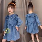 ワンピース キッズ 長袖ワンピース 子供服 女の子 秋 冬 デニムワンピース 折り襟 無地 子供ドレス ジュニア フレア おしゃれ 可愛い カジュアル 新品 150 160