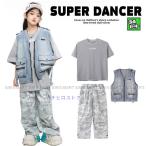 ヒップホップ ダンス衣装 セットアップ Tシャツ フィッシングベスト パンツ キッズダンス衣装 子供ダンス服 ダンスウェア 韓国 K-POP 緑 紫