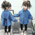 長袖デニムシャツ キッズ 子供服 トップス 春秋 女の子 ガールズ シャツワンピ ワンピース チュニック リボン カジュアル 袖しぼり ゴム入り 動き