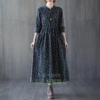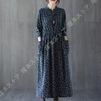 大人 可愛い かわいい レトロ ロング 花柄 チュニック ワンピース レディース ウエストリボン ロングワンピース 長袖 襟付き オシャレ ふんわり 柔らか ドレス