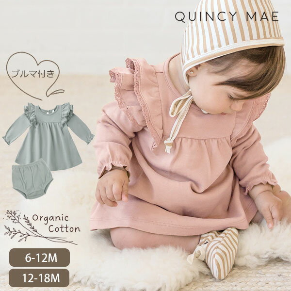 QUINCY MAE オーガニックコットン ベビー フラッタードレス(長袖)&ブルマ | クインシーメイ オーガニック コットン ベビー 服 ウエア ワンピース ドレス スカート 出産祝い 誕生祝 ギフト プレゼント 綿 やわらか ナチュラル 女の子 レース フリル Aライン [M便 1/1]