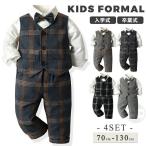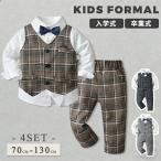 送料無料 子供服 スーツ 上下4点セット 男の子 キッズ ベビー フォーマル チェック柄 結婚式 発表会 入学 入園 卒園 七五三 シャツ 長袖 ベスト 蝶ネクタイ 長ズボン ロングパンツ セットアップ アウター トップス 前開き ボトムス ウエストゴム ポケット カジュアル おしゃ