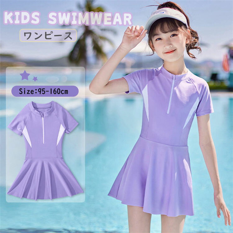 【3点15%offクーポン配布中! キッズ 水着 女の子 スクール水着 ワンピース ジュニア ベビー水着 インナーパンツ付き 紫 半袖 可愛い スイムウエア ビーチウエア プール 温泉 小学生 中学生 幼稚園 こども 水着 95-160cm