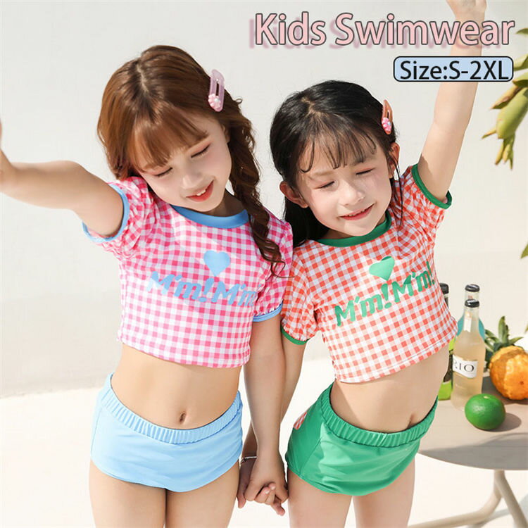 【3点15%offクーポン配布中! キッズ 水着 女の子 セパレート 140 チェック柄 ピンク タンキニ フィットネス水着 ベビー水着 キャップ付き カワイイ ビーチウエア プール 温泉 みずぎ ビキニ水着 半袖 ジュニア かわいい 子供 女児 こども 85-140cm