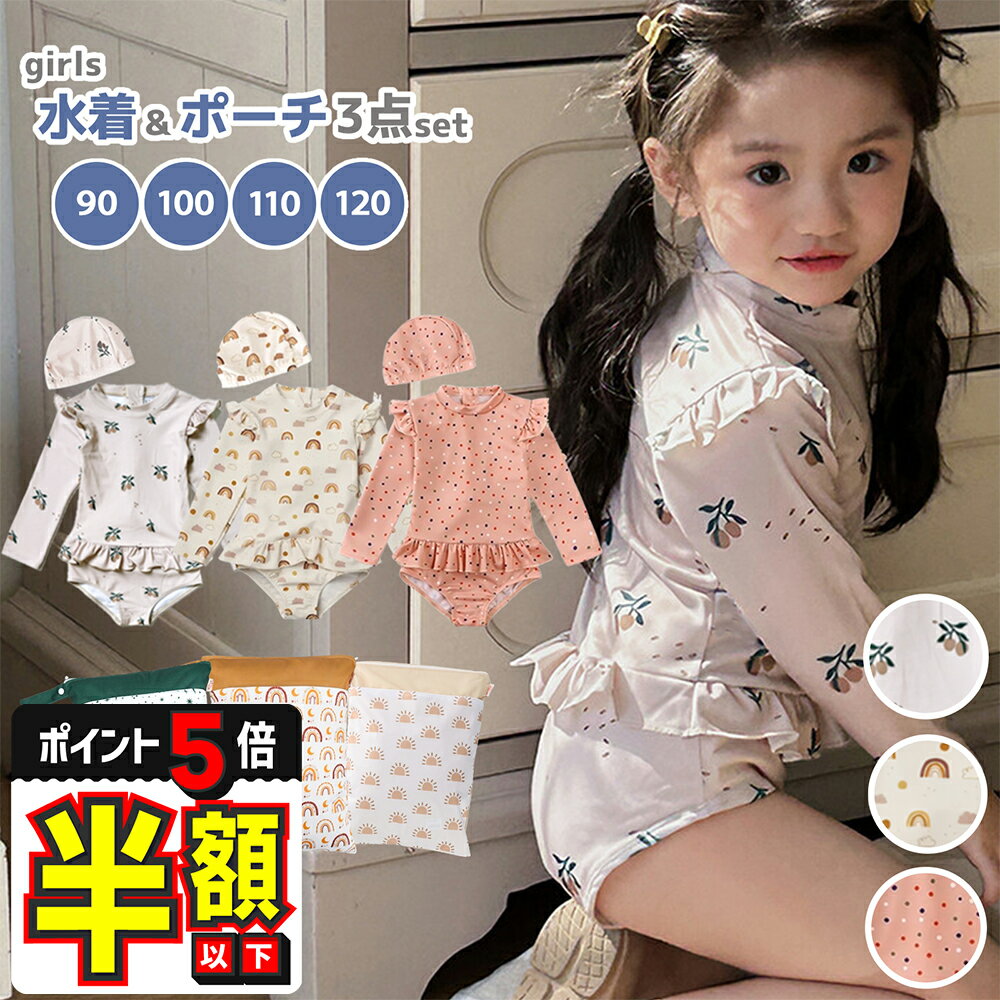 【30%OFFクーポン+p5倍】キッズ 水着 女の子 ベビー 90 100 110 120 ワンピース 帽子 防水ポーチ 3点 セット UVカット ベビースイミング 子供 ジュニア かわいい フリル スイムウェア 海プール スイミング ビーチ 紫外線