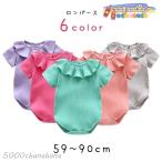 ロンパース ベビー服 赤ちゃん 女の子 トップス 半袖 丸首 ラウンドネック 背中ボタン 襟フリル スナップボタン 無地 ピンク オフホワイト グレー