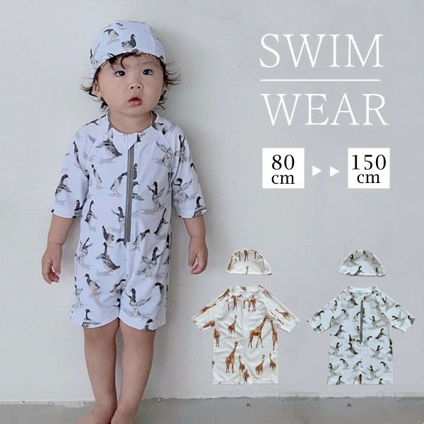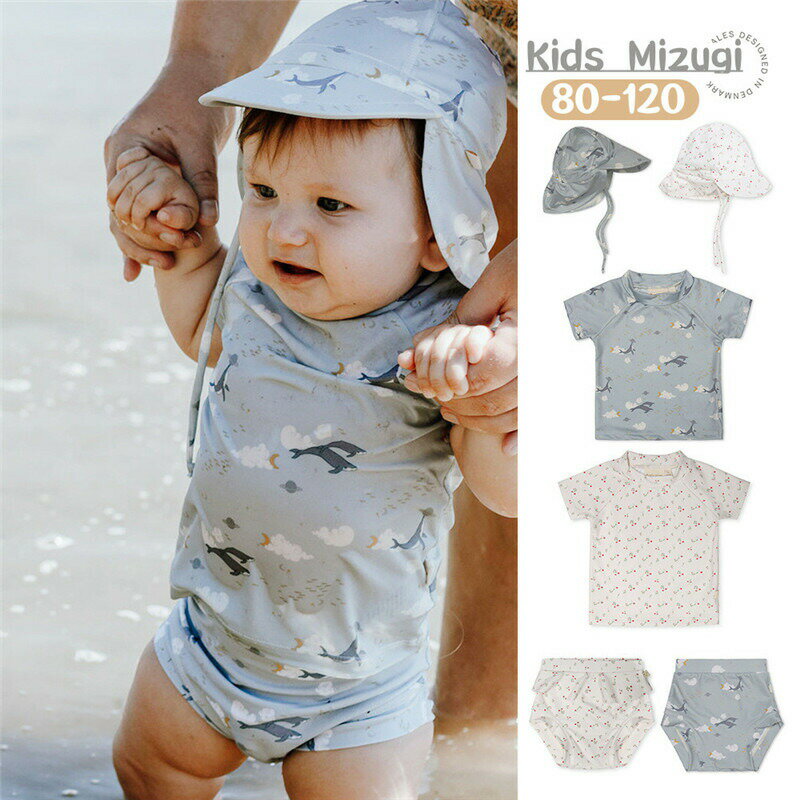ベビー男の子ラッシュガードセット ベビー 水着 キャップ付き 2点セット オールインワン ベビースイミング 花柄 水遊び着 北欧スタイル 水着セット