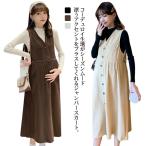 ジャンパースカート マタニティ ジャンスカ コーデュロイ Vネック フロントボタン ノースリーブ ワンピース ロング 妊婦服 ゆったり 春 秋 冬 体