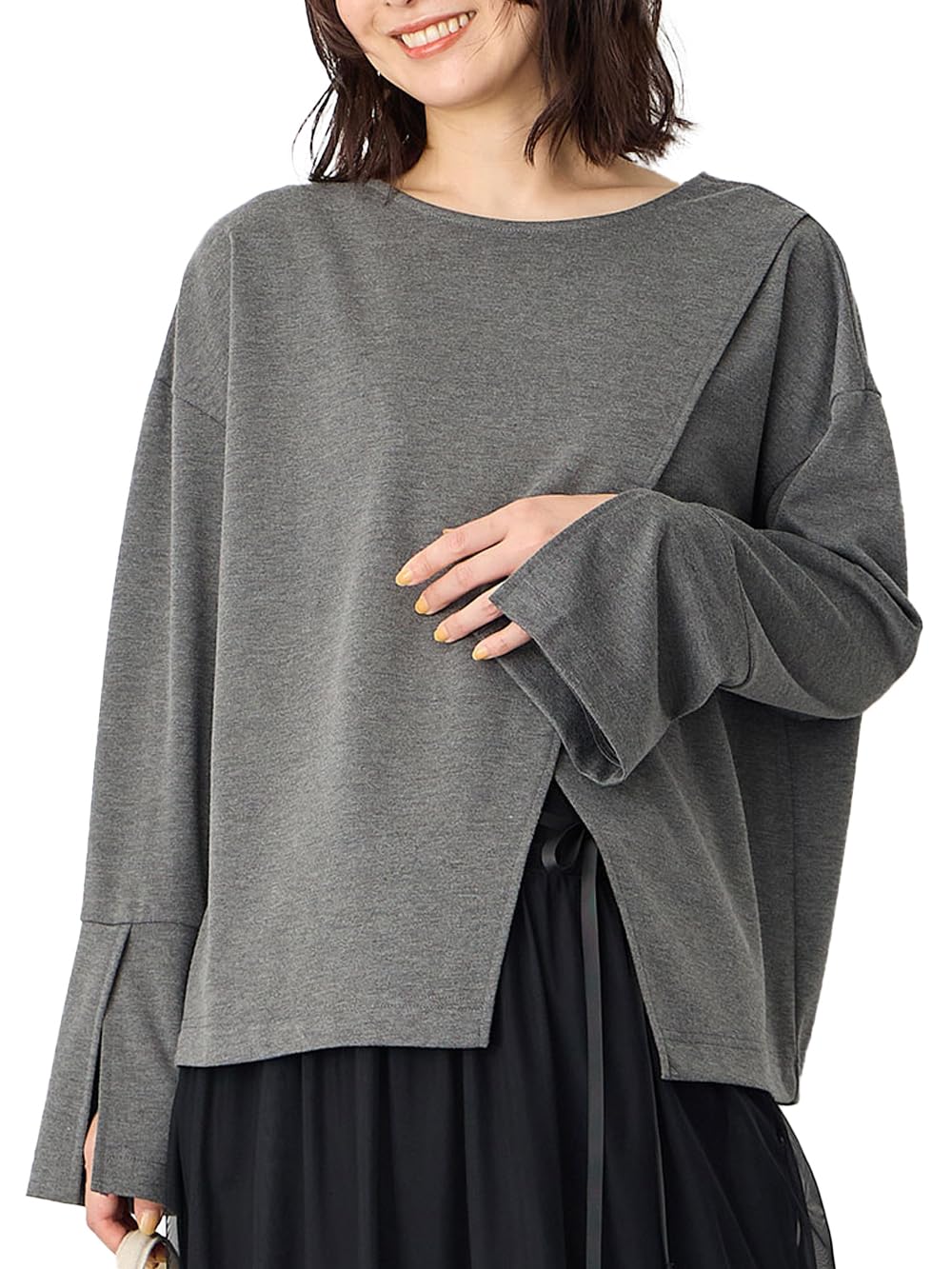 【送料無料】[ANGELIEBE エンジェリーベ] レディース マタニティ 授乳 クロス スリット ベルスリーブ プルオーバー トップス 授乳服 産前 産後 長袖 カットソー 10427 色:杢グレー、サイズ:Free Size