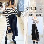 マタニティ 服 授乳服 ローラ・ボーダー&ウエストリボンフレアードッキングワンピース 授乳口付き ジッパータイプ 卒乳後OK