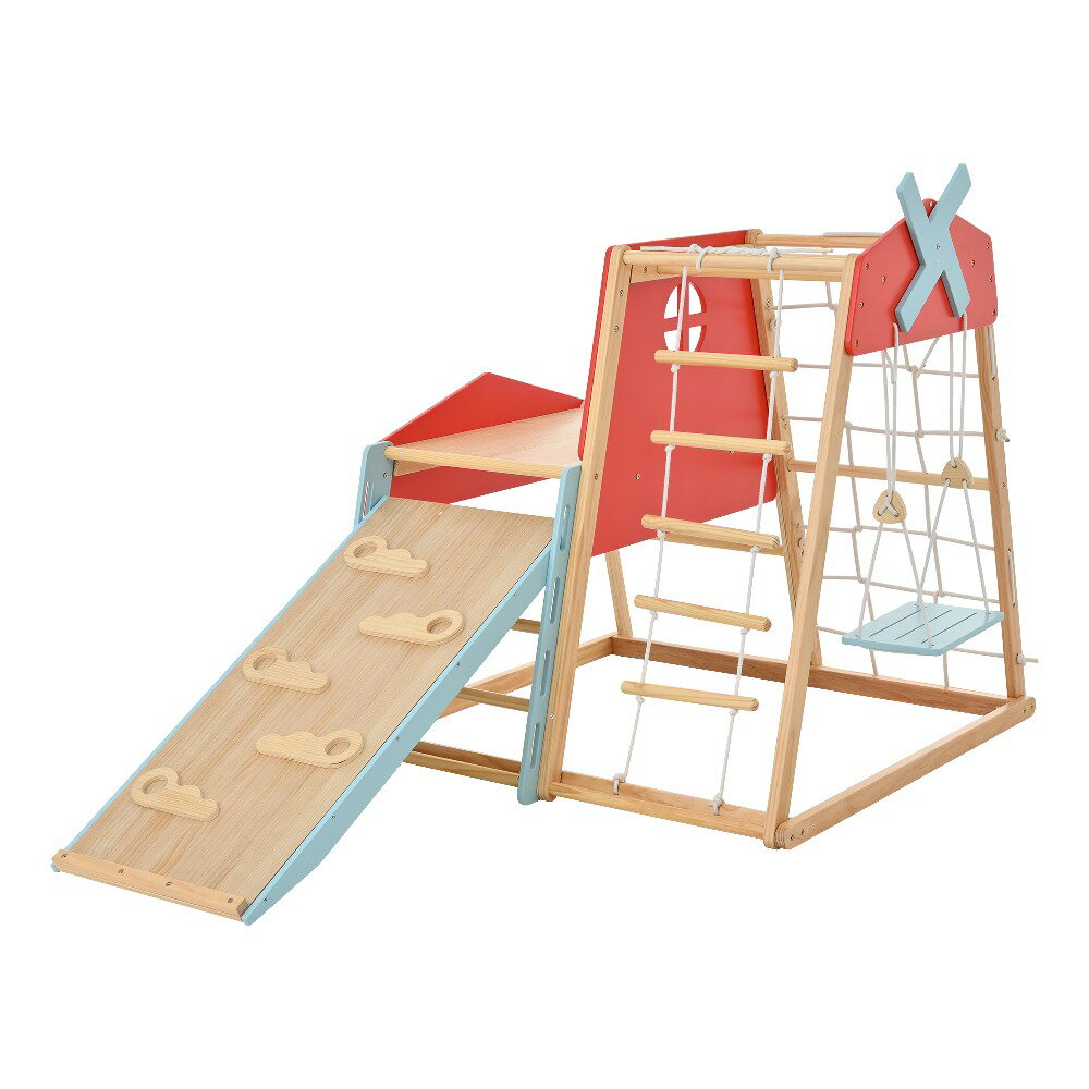 【レビュー投稿で5%OFFクーポン】大型木製ジャングルジム 室内用 すべり台・ブランコ付き カラフル風車付き 折りたたみ収納可能 天然木使用 耐荷重50kg EN71安全基準適合