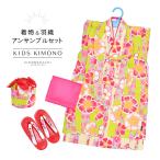 (Prices down2)女の子 着物セット「黄緑 ピンク×白×赤の桜」アンサンブル 着物 兵児帯 羽織 草履 巾着 3歳〜4歳 5歳〜6歳 7歳〜8歳 9歳〜10歳(メール便不可)