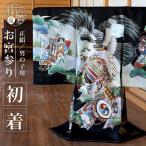 お宮参り 男の子 初着 産着 鷹に陣太鼓 黒色 正絹 一つ身 鷹 防具 松 太鼓 御所車 着物 羽織 和服 誕生記 セット ベビー 赤ちゃん 男 ブラック