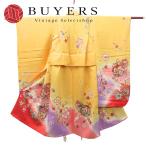 中古 子供着物 祝い着 肩揚げ・腰上げ済 正絹 山吹色 ピンク系 3歳用 七五三 お宮参り 和装 呉服 和服 きもの