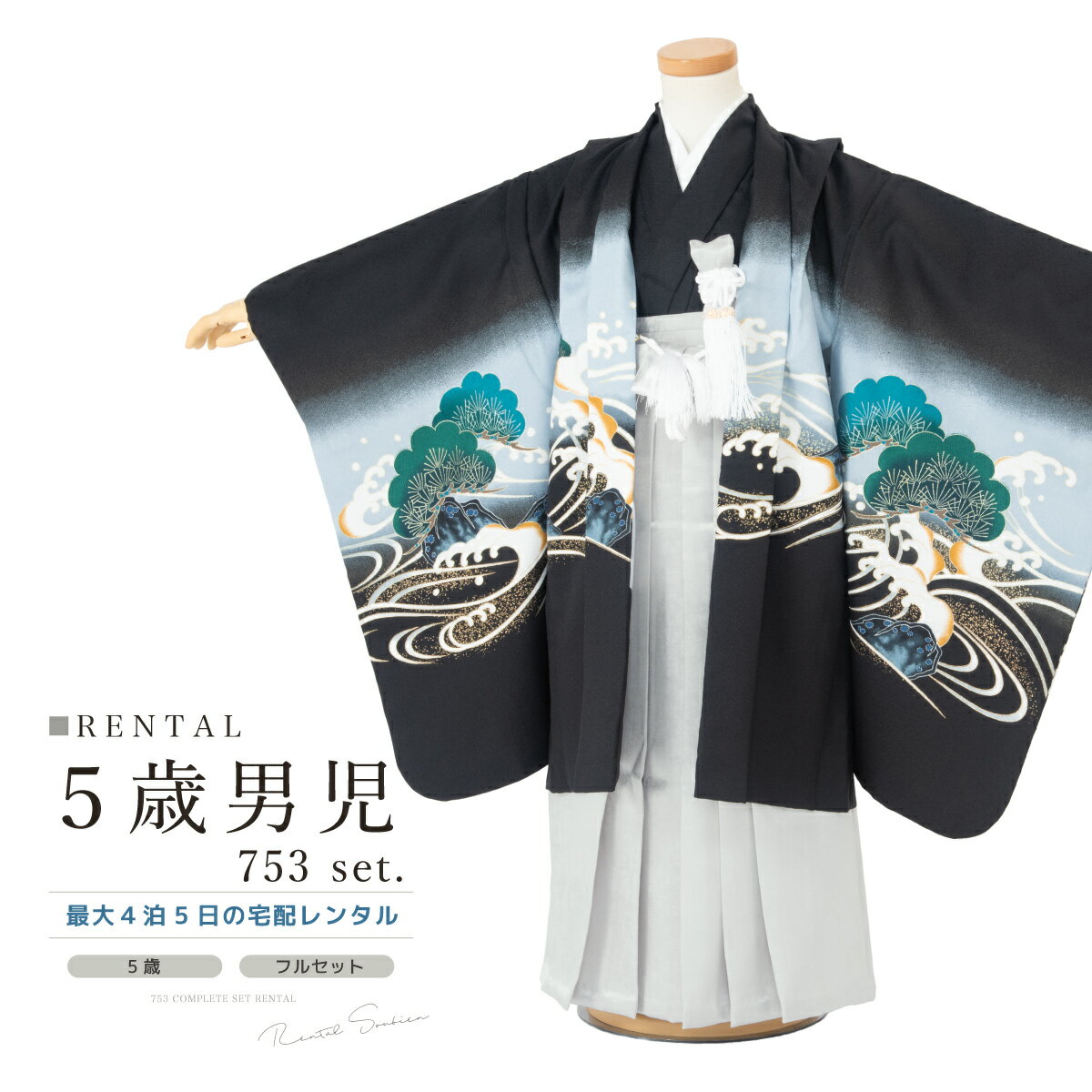 【12/1限定☆クーポンで10%OFF】七五三 着物 男の子 5歳 レンタル 羽織袴 袴セット フルセット 黒 ブラック 白 鷹 宝尽くし 波 巻絹 着物レンタル 五歳 袴 子供着物 男児 モダン 創美苑【往復送料無料】