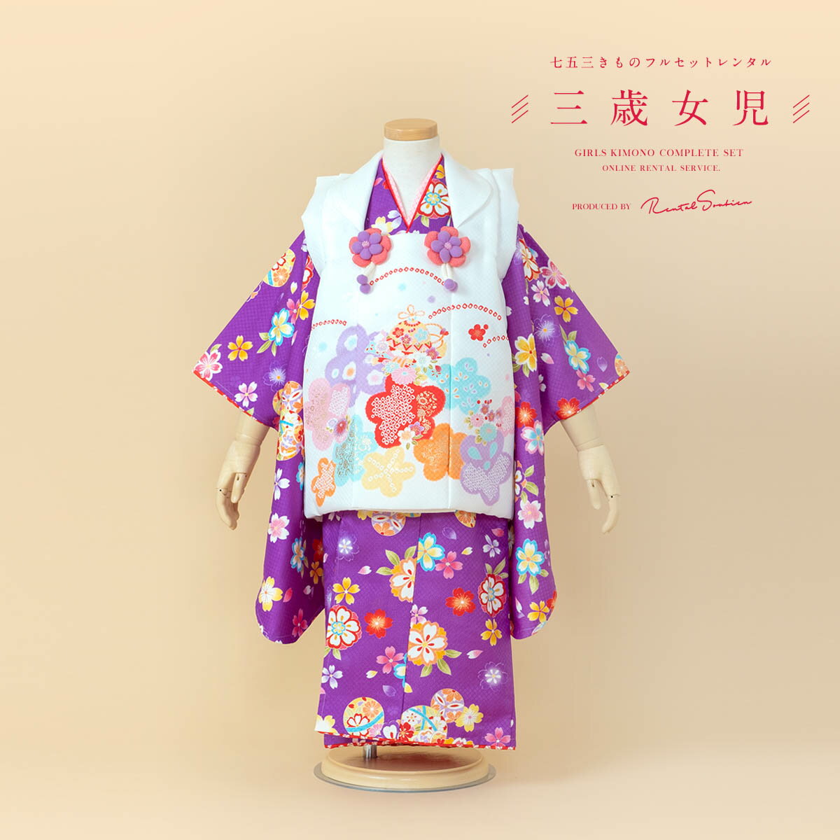 【12/1限定☆クーポンで10%OFF】【レンタル】 七五三 女の子 3歳 フルセット 着物セット レンタル 被布セット 白 ホワイト 紫 桜尽くし 手鞠 熨斗 着物レンタル 三歳 子供着物 女児 可愛い 創美苑 往復送料無料