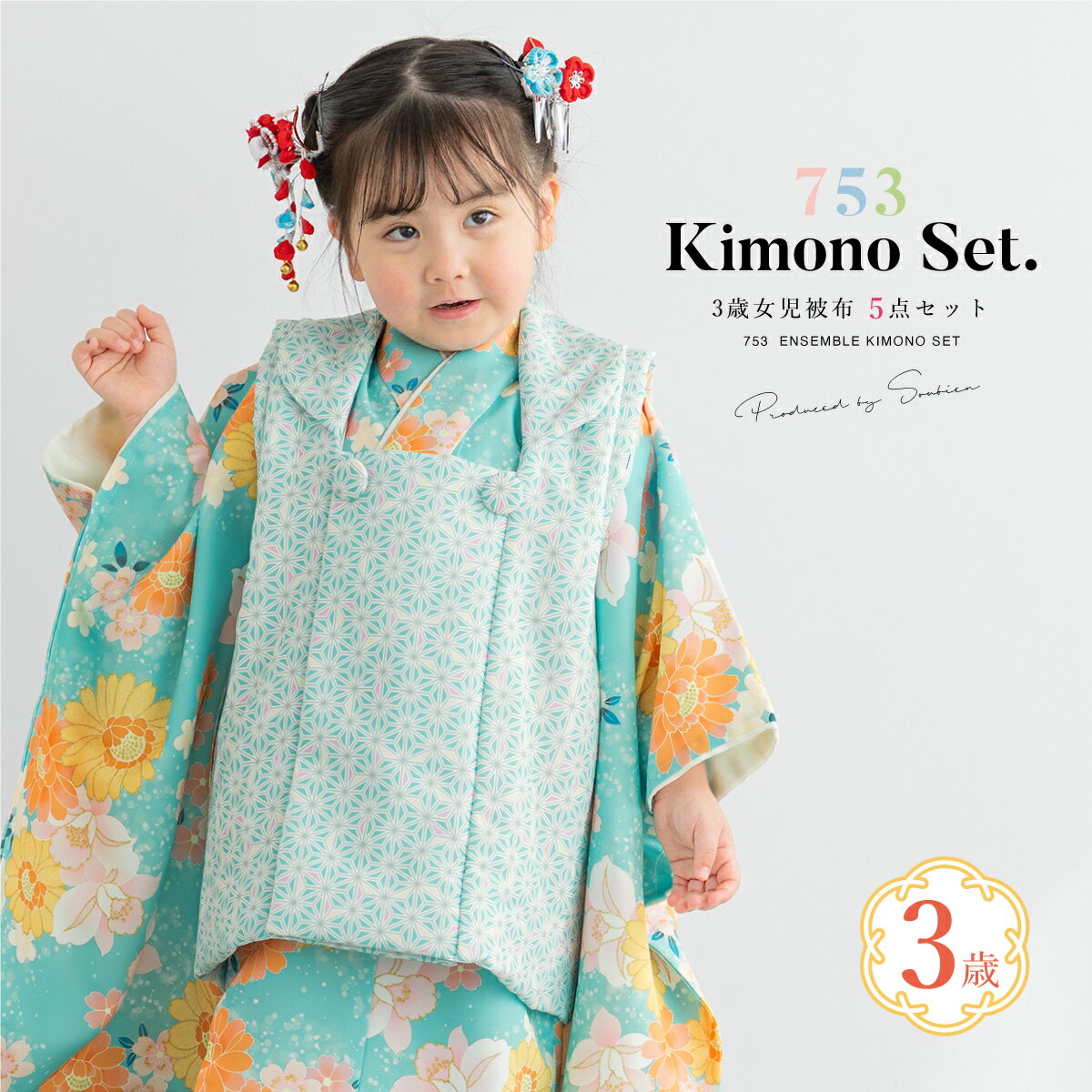 【12/1限定★クーポンで10%OFF】七五三 着物 3歳 女の子 着物セット 被布 襦袢 草履 巾着 水色 青 緑 黄色 オレンジ ピンク 花柄 レトロ モダン くすみ 三歳 子供着物 女児 ひな祭り お正月 肩上げ済 腰上げ済 購入 創美苑 送料無料