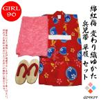 子供浴衣セット 90cm前後 1-2才 女児 浴衣 兵児帯 草履 16.5cm 3点セット 綿紅梅 レッド トンボ