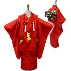 七五三 着物 3歳 フルセット 市松と花紋の地模様 RED&イエロー 髪飾りプレゼント