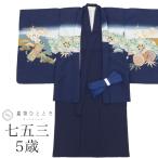 中古 七五三 男の子 5歳 3点セット 化繊 着物 羽織 長襦袢 美品 仕立て上がり 紺 兜 松 軍配 羽織丈71.5cm 裄丈50.5cm