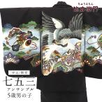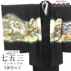 中古 七五三 男の子 5歳 3点セット 化繊 着物 羽織 長襦袢 美品 仕立て上がり 黒 鷹 鼓文 片輪車 羽織丈61cm 裄丈46cm