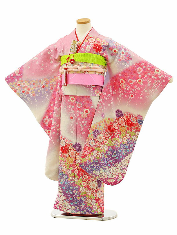 七五三 着物 7歳 着物フルセット 紅ピンク染分け切替着物 流れぼかし 桜流水ピンク地帯セット 足袋に腰紐など20点フルセット