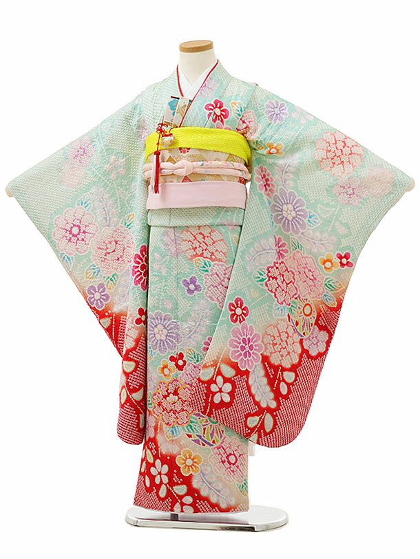 七五三 着物 7歳 フルセット 女の子 水色 ピンク くすみ色 結び帯 筥迫セット 花柄 四つ身 桜 着物フルセット 販売 購入 yotsumi-00027