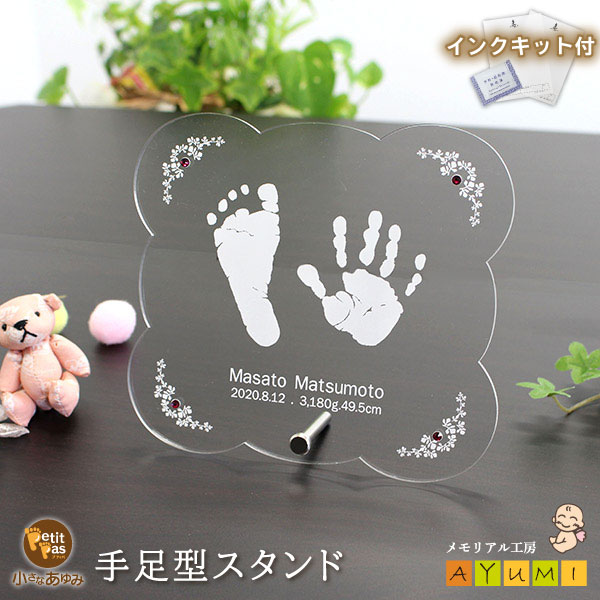 【17%OFF!! 12/4~ スーパーセール★】赤ちゃん 手形 足形 アクリル スタンド 誕生石付き オーダーメイド 日本製 インク キット付 おしゃれ 命名書 手型 足型 実寸大 名入れ 新生児 0歳 出産祝い 内祝い プレゼント ギフト【小さなあゆみ】(手足型スタンド/プリティ)