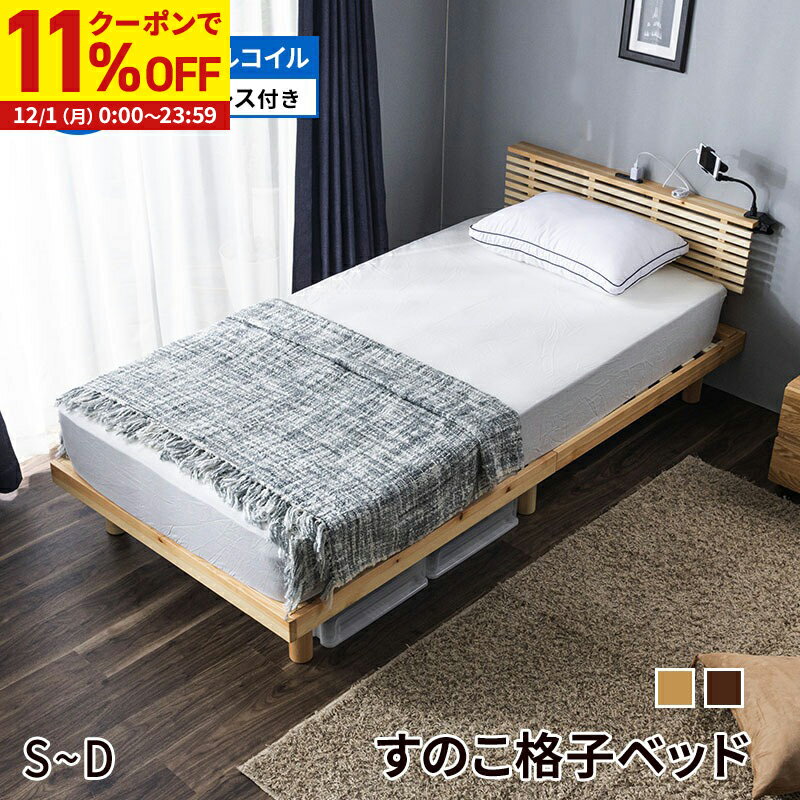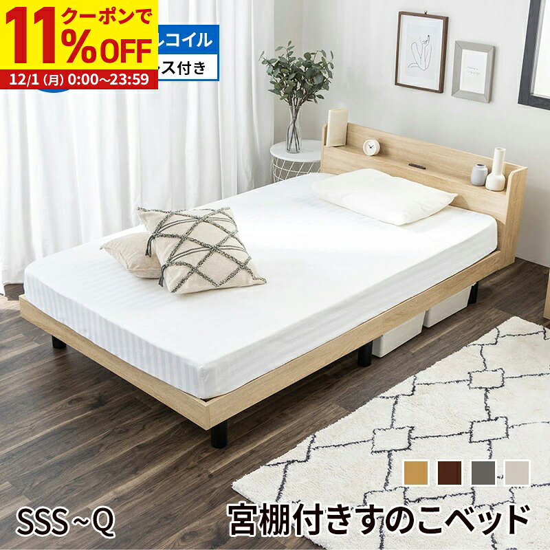 【11%OFFクーポン配布中★12/1に使える】 ベッド すのこベッド シングル セミダブル ダブル マットレス付き ボンネルコイルマットレス おしゃれ 天然パイン材 2口コンセント付き 宮付き ローベッド 頑丈 シンプル 天然木フレーム 木製ベッド