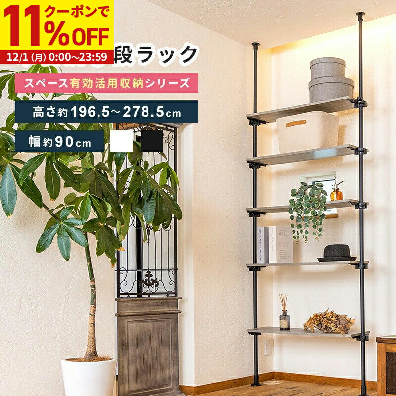 【11%OFFクーポン配布中★12/1に使える】 つっぱり オープンラック 棚 収納 ラック 5段 木製 90cm つっぱり棚 壁面収納 収納ラック つっぱり収納 白 ホワイト ブラック 収納棚 リビング デスク つっぱり棒 伸縮 高さ調節 おしゃれ