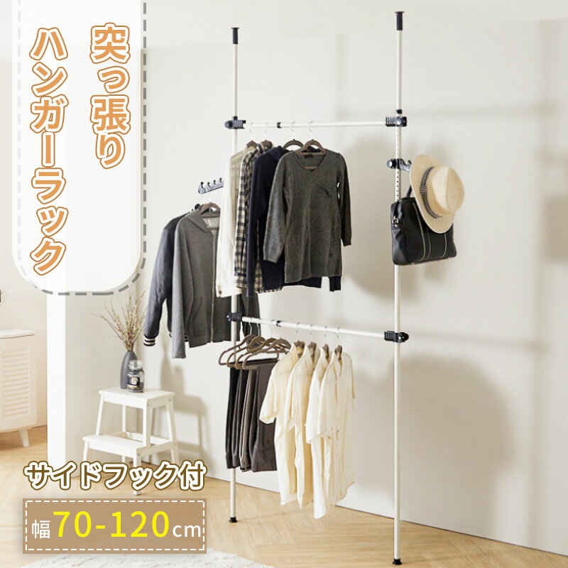 【月末感謝SALE限定!10%OFF】RAKU 突っ張り ハンガーラック 突っ張りラック 収納ラック 洋服ラック 洋服かけ 布団干し 2段 幅60-110cm 高さ約182-265cm たっぷり収納 縦横伸縮 設置カンタン 工具不要 翼デザインのフック 衣類収納 物干しハンガー