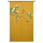 麻のれん 「薔薇に文鳥」 手描きのれん のれん 本麻 万葉舎 ロング丈 薔薇 バラ 文鳥 金茶 日本製 タペストリー 和柄 インテリア 暖簾 麻100% 麻 88cm×150cm