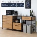 キッチンカウンター 幅180 食器棚 カウンター 収納 レンジ台 ワイド ステンレス天板 オーク材 突板 ウレタン塗装 フルオープンレール 2口コンセント