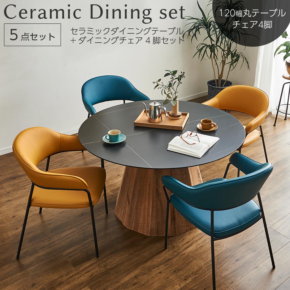 [割引品]+12/4 20:00〜 5%OFFクーポン配布 ダイニングセット セラミック 円形 5点セット 120テーブル チェア4脚 おしゃれ ベージュ ブラック 座面 ブルー イエロー ラウンドテーブル 石目調 120丸 合成革皮 背もたれ付き PU 肘付き パイン材 丈