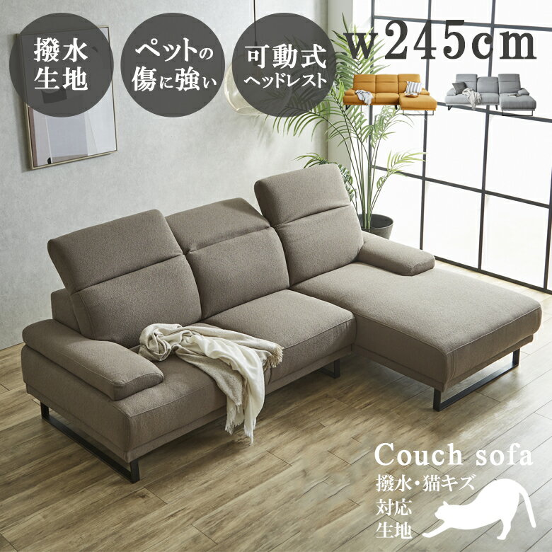 \12/4 4h限定☆対象商品に使える8%offクーポン配布中/ カウチソファ 3人掛け 幅245cm ソファ 可動式 撥水加工 おしゃれ 北欧 カウチ ヘッドレスト 背もたれ ファブリック 猫キズ ソファー ウレタンフォーム アイアン脚 イエロー グレー ブラウン