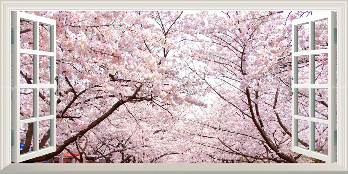 絵画風 壁紙ポスター (はがせるシール式) -窓の景色- さくらの開花 春の景色 桜の木 サクラ 八重桜 ソメイヨシノ 【窓仕様/トリックアート】 キャラクロ FSKR-025MS1 (パノラマS版 1152mm×576mm) <日本製> ウォールステッカー 窓 お風呂ポスター