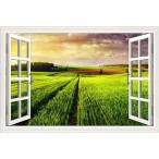 Mestiker 緑の麦畑 ウォールステッカー 偽窓 青空 白雲 緑の芝生 窓 草原 白い野の花 風景