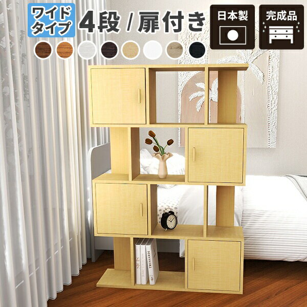 ラック シェルフ 収納棚 完成品 幅74cm 4段 扉付き 収納 おしゃれ 北欧 木製 国産 日本製 ハイタイプ 引き出し付き 大容量 ブラウン