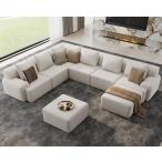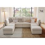 【並行輸入品】Kalafini 特大セクショナルソファ リビングルーム用 ベージュ U字型ボーンレスカウチ 6人掛けソファ 可動オットマン2個付