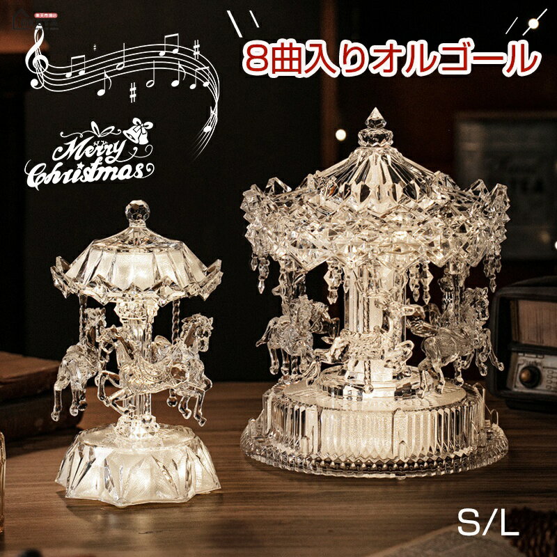 \20%OFF&2点ご購入で/オルゴール クリスタルオルゴール 透明 音楽再生 8曲内蔵 回転木馬 オルゴールクリスマス定番曲 音量調節可能 自動360度回転 ウォームホワイトLED 馬鹿デザイン USB電池両用 卓上ライト インテリア ギフト 贈り物 クリスマス飾り