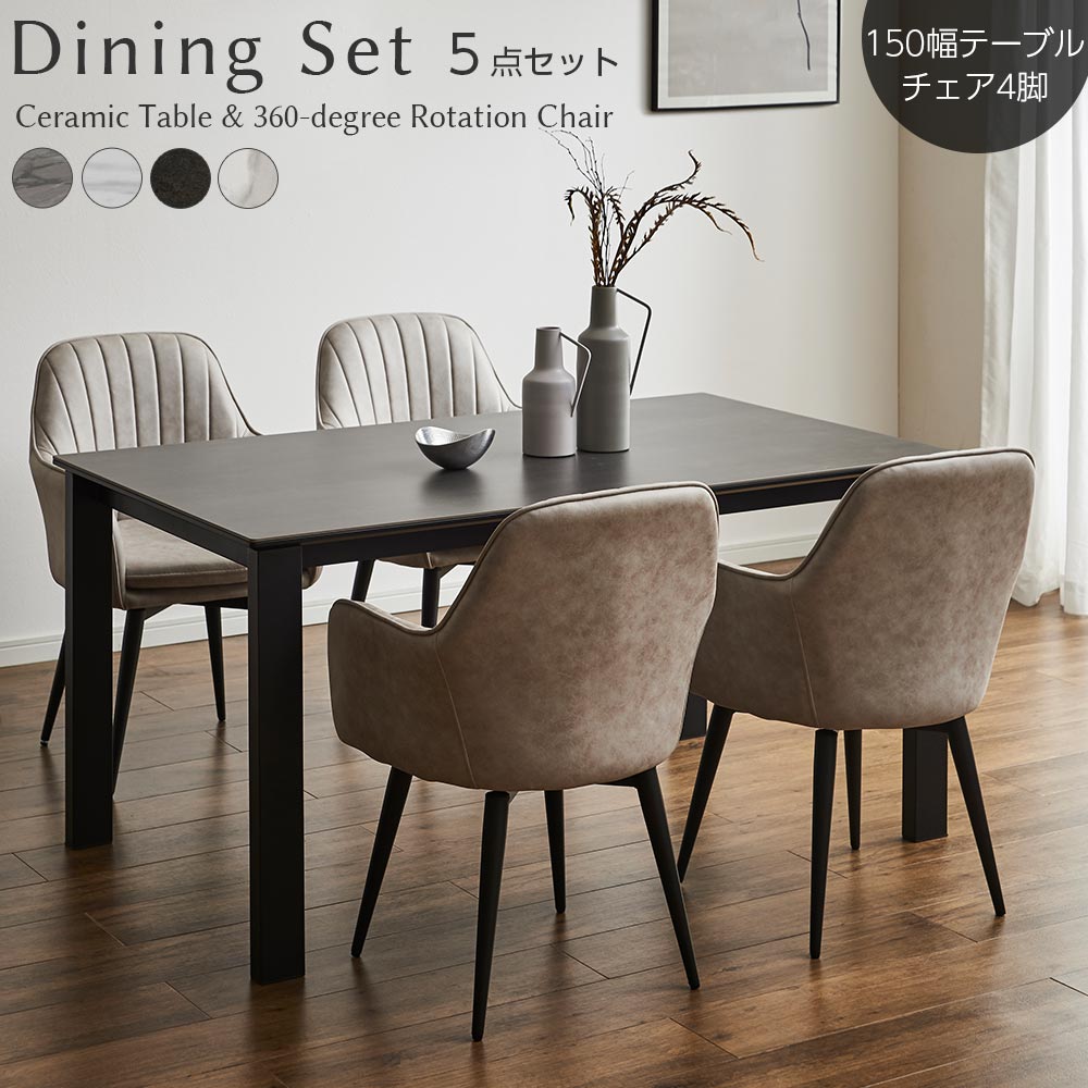 [半額品] +12/4 20:00〜 5%OFFクーポン配布 ダイニング5点セット 幅150cm チェア4脚 セラミック アイアン 肘付き 360度 回転 ファブリックレザー 食卓 椅子 回転式 北欧風 4人 ブラック 石目調 ホワイト グレー ブラウン オレンジ グリーン