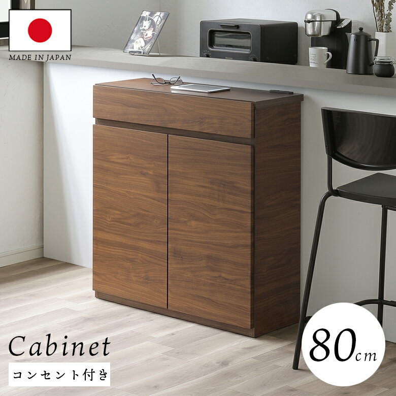 【全商品に使える2%offクーポン!!】 キャビネット サイドボード 80cm幅 収納 リビング収納 カウンター下 開き扉 引き出し 薄型 おしゃれ シンプル 引出箱組 フルスライドレール 2口コンセント付き 耐震ダボ仕様 強化シート ナチュラル ホワイト