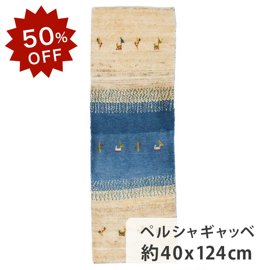 【50%OFF!楽天スーパーSALE限定!】ペルシャギャッベ 約40cm x 124cm 廊下敷き ベッドサイド ランナー 細長 青 ナチュラル ベージュ ブルー グラデーション ウール100% 羊毛 天然 ふかふか モコモコ 厚手 動物 ホットカーペット対応 床暖房対応 オールシーズン 現品限り